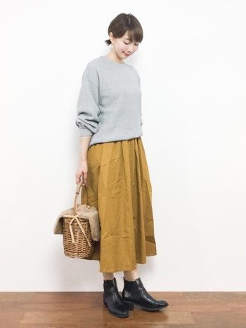 からし色スカートはグレーを合わせると秋らしい印象に。 ナチュラルなカゴバックも素敵です。 ブラックのブーツがコーデを引き締めてくれています。